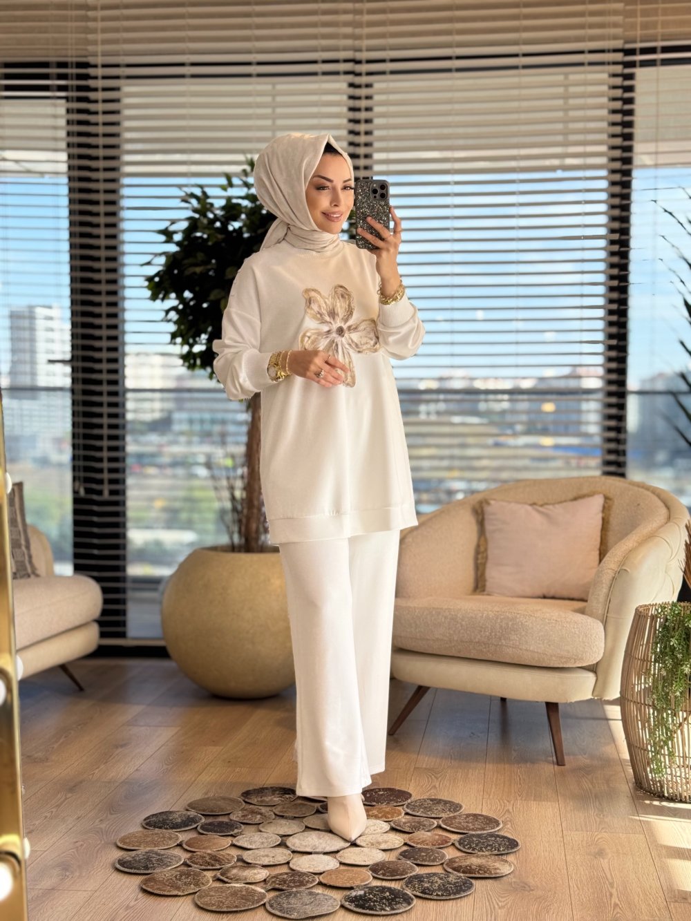 02-2698 Ön Büyük Çiçek Nakışlı Takım Ekru