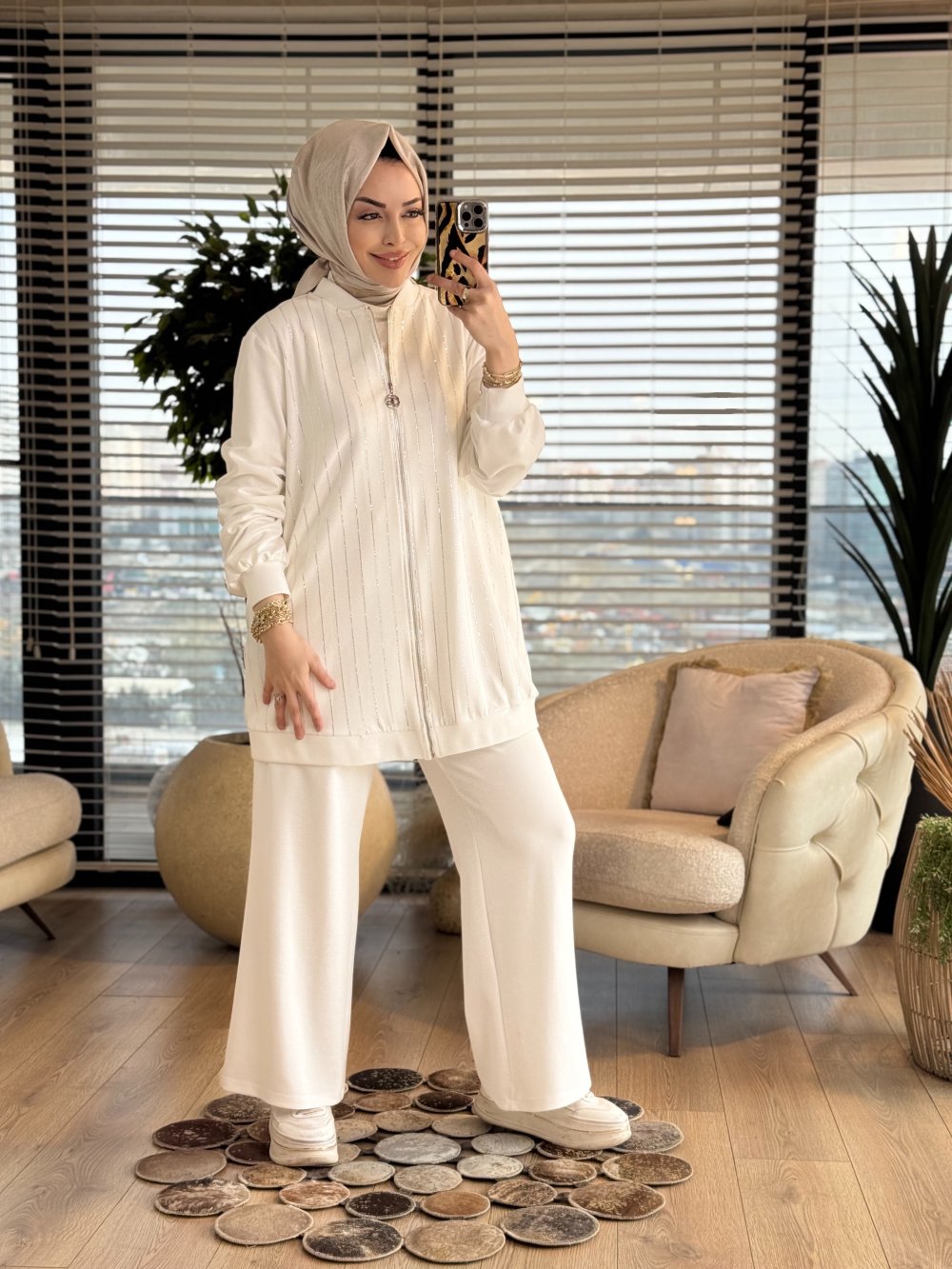 02-2726 Ön Boyuna Taş Baskılı Takım Ekru