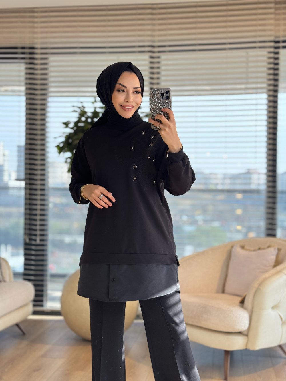 10739 Sağ Omuz Nakış Ve Taş İşlemeli Tunik Siyah