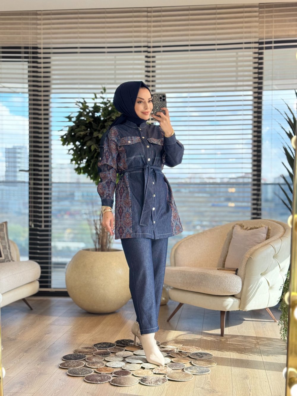 1397 Tencel Kol Ve Yanları Desenli Takım Lacivert Bordo