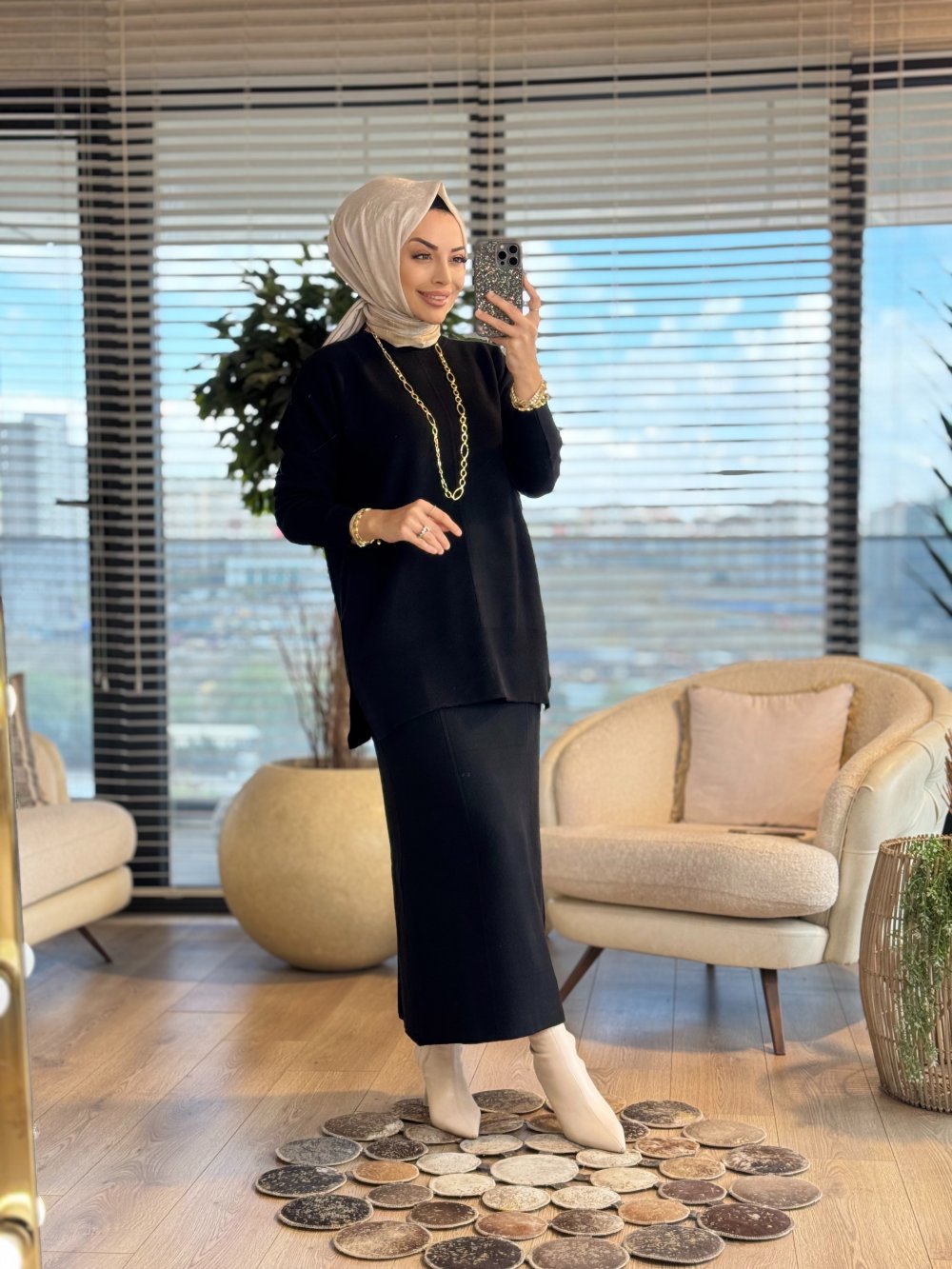 14900-1 Ön Tek Çizgili Triko Etekli Takım Siyah