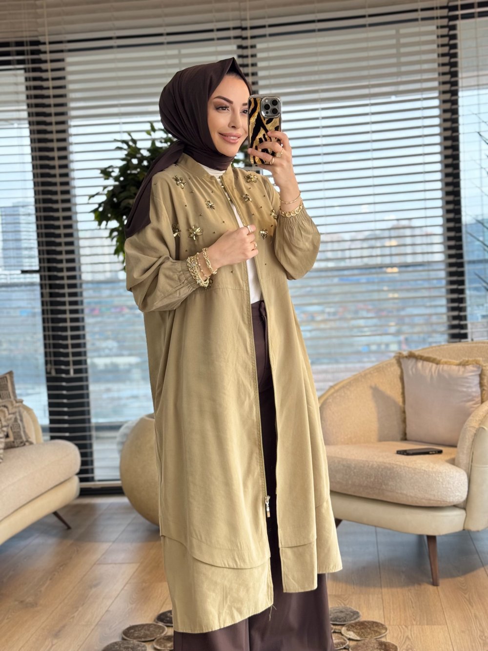 15253 Ön Taş Çiçek İşleme Cepli Fermuarlı Kap Yağ Yeşili