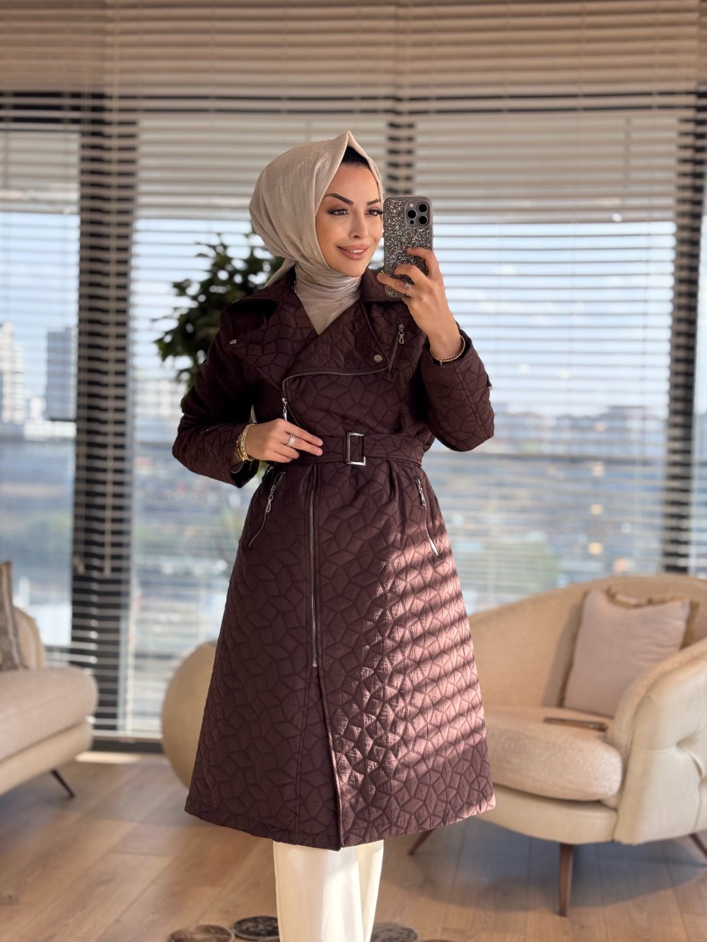 20212 Kendinden Desenli Fermuarlı Kaban Kahve
