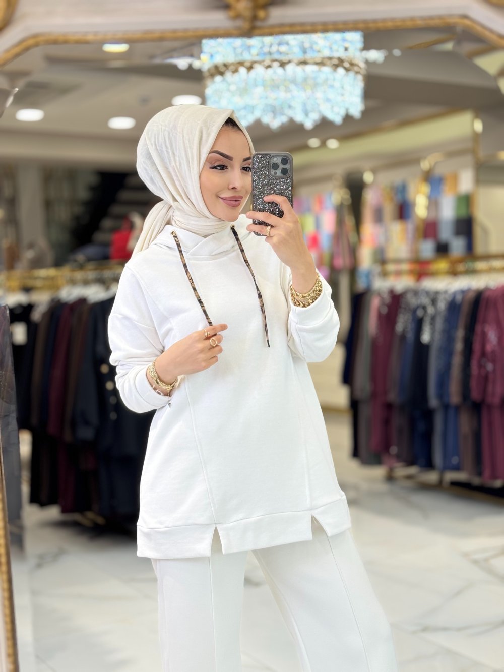 2135 Arkası Desenli Yıldızlı Kapşonlu Tunik Ekru