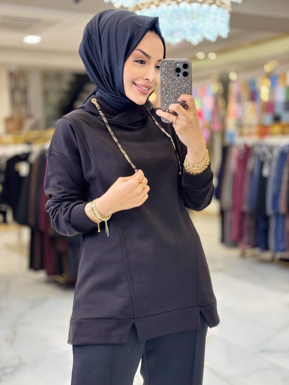 2135 Arkası Desenli Yıldızlı Kapşonlu Tunik Siyah