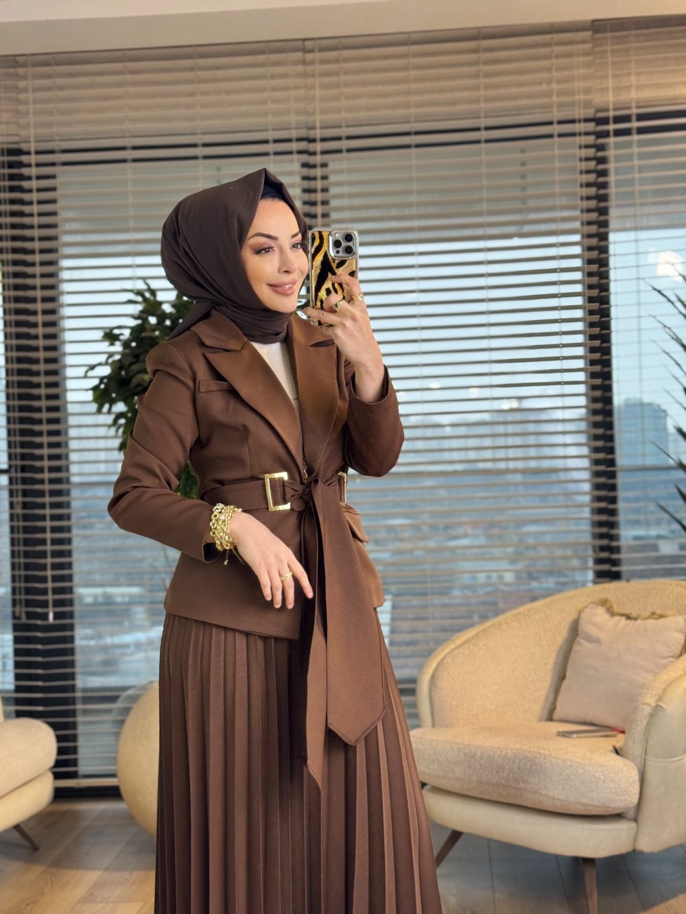 2194-1 İki Düğme Ceket Pilise Etekli Takım Kahve
