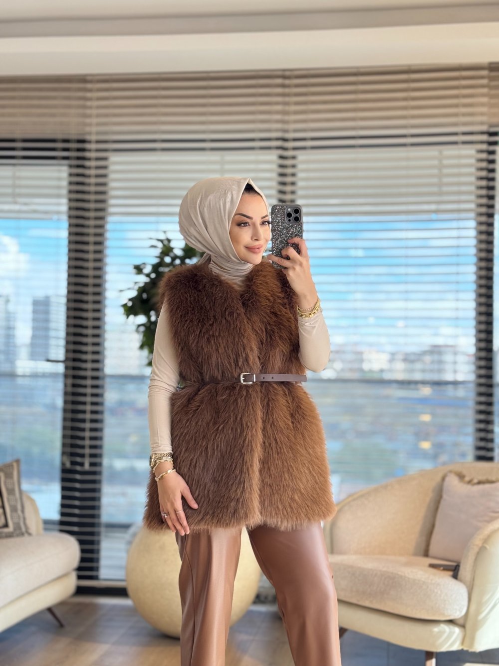 2205 Peluş Kemerli Yelek Kahve
