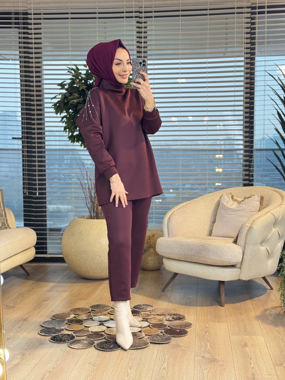 22159 Omuzları Taş İşlemeli Takım Bordo