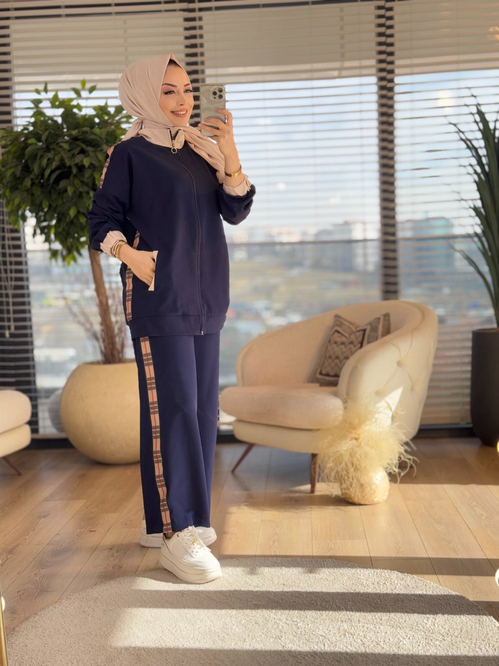 22645 Omuz Ve Yanları Kare Desenli Takım Lacivert