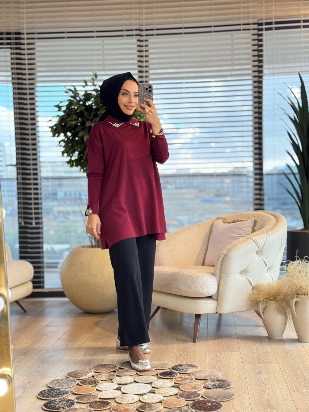 239 Yakası Pırlanta Taşlı Triko Tunik Bordo