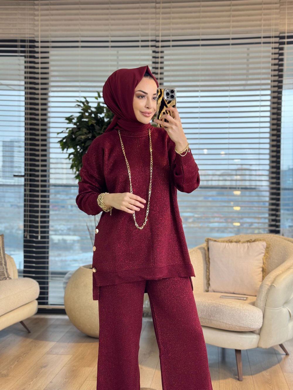 24349 Yanları Düğmeli Simli Triko Takım Bordo