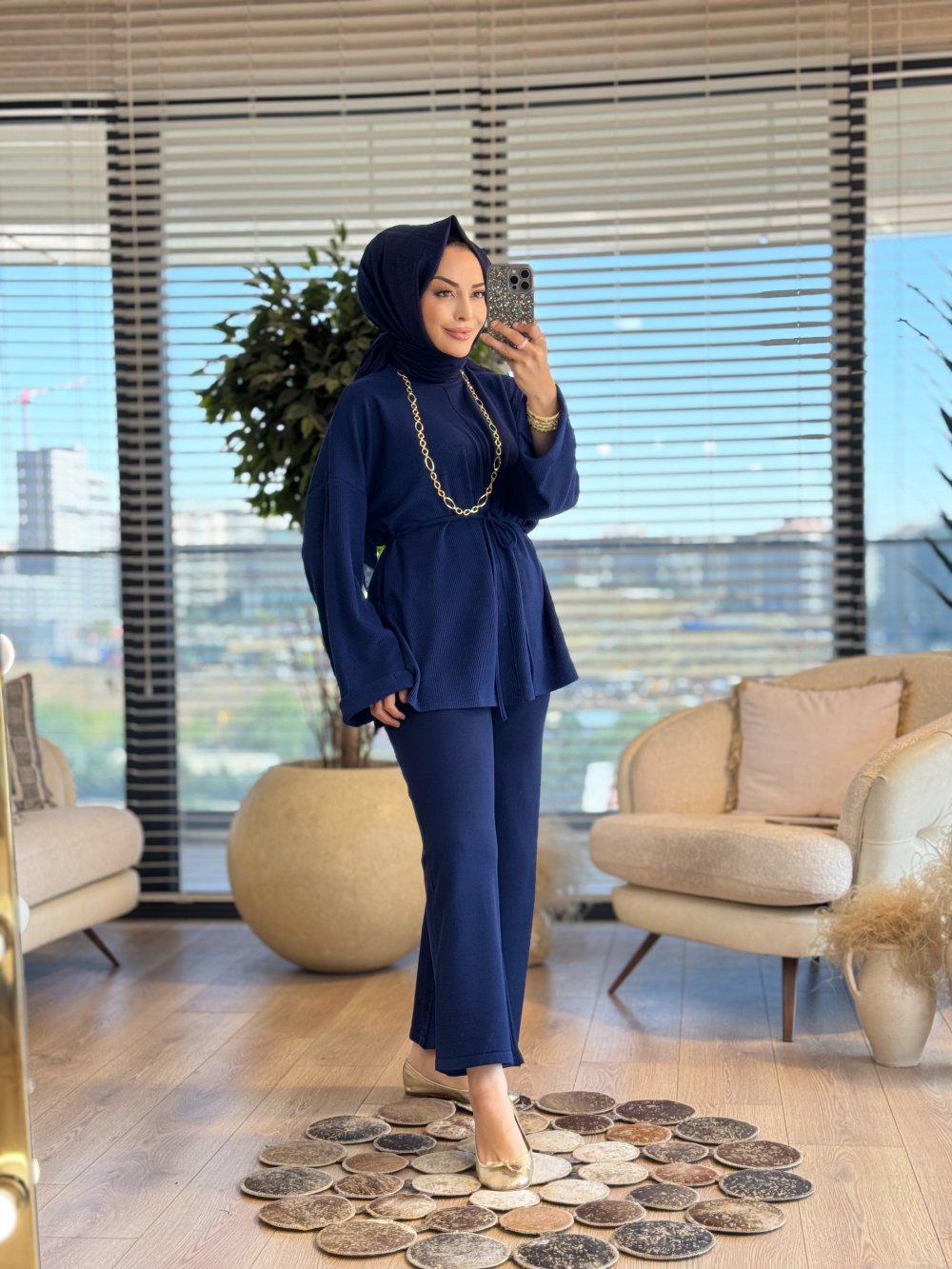 24357 Kendinden Çizgili Kolu Katlamalı Tunik Lacivert