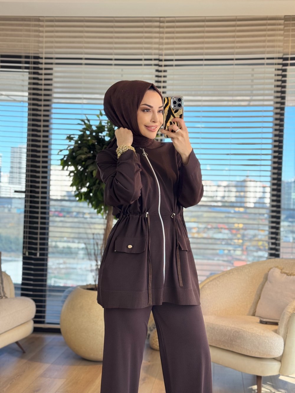 25200 Spor Fermuarlı Broşlu Triko Takım Kahve
