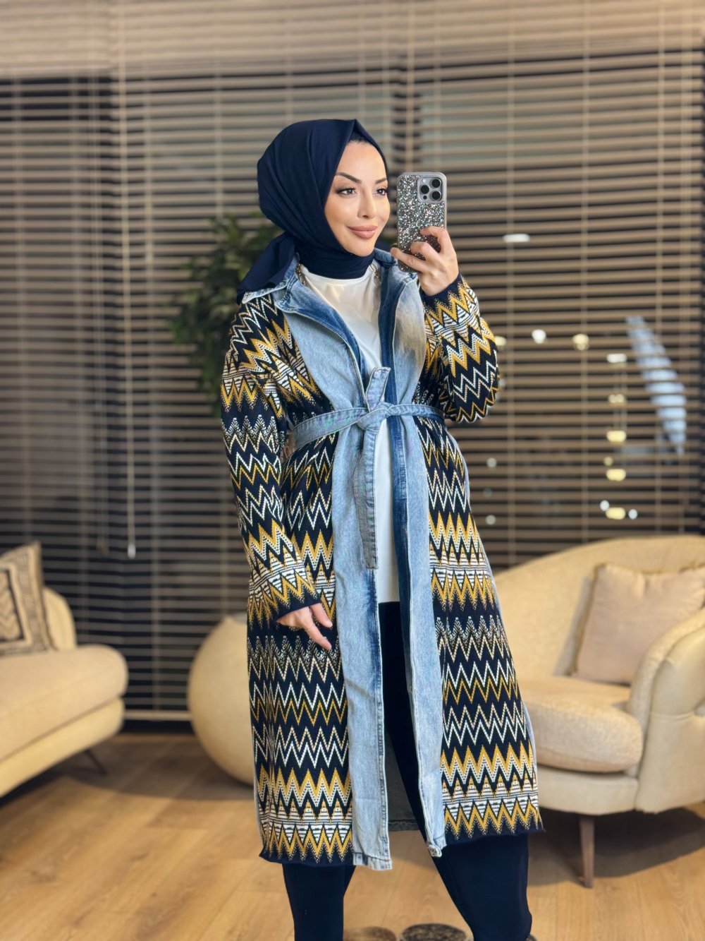 25560 Renkli Uzun Kot Triko Hırka Mavi Sarı