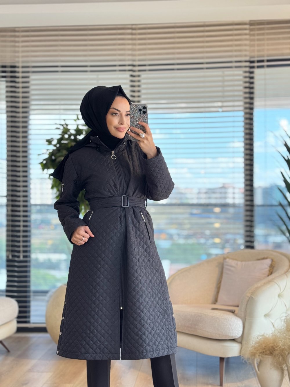 2577 Kraş Kapitone Cep Fermuarlı Kaban Siyah