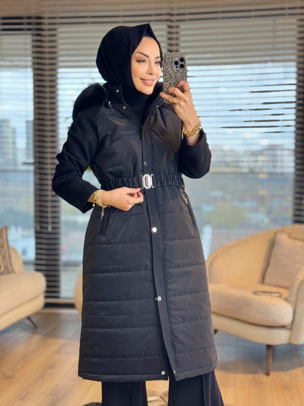 2582 Kombinli Kapitone Kapşonu Kürklü Kaban Siyah