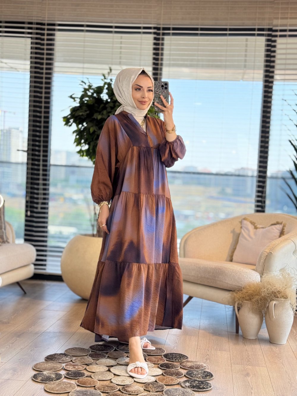 25EL471 Batik Desen V Yaka Elbise Kahve