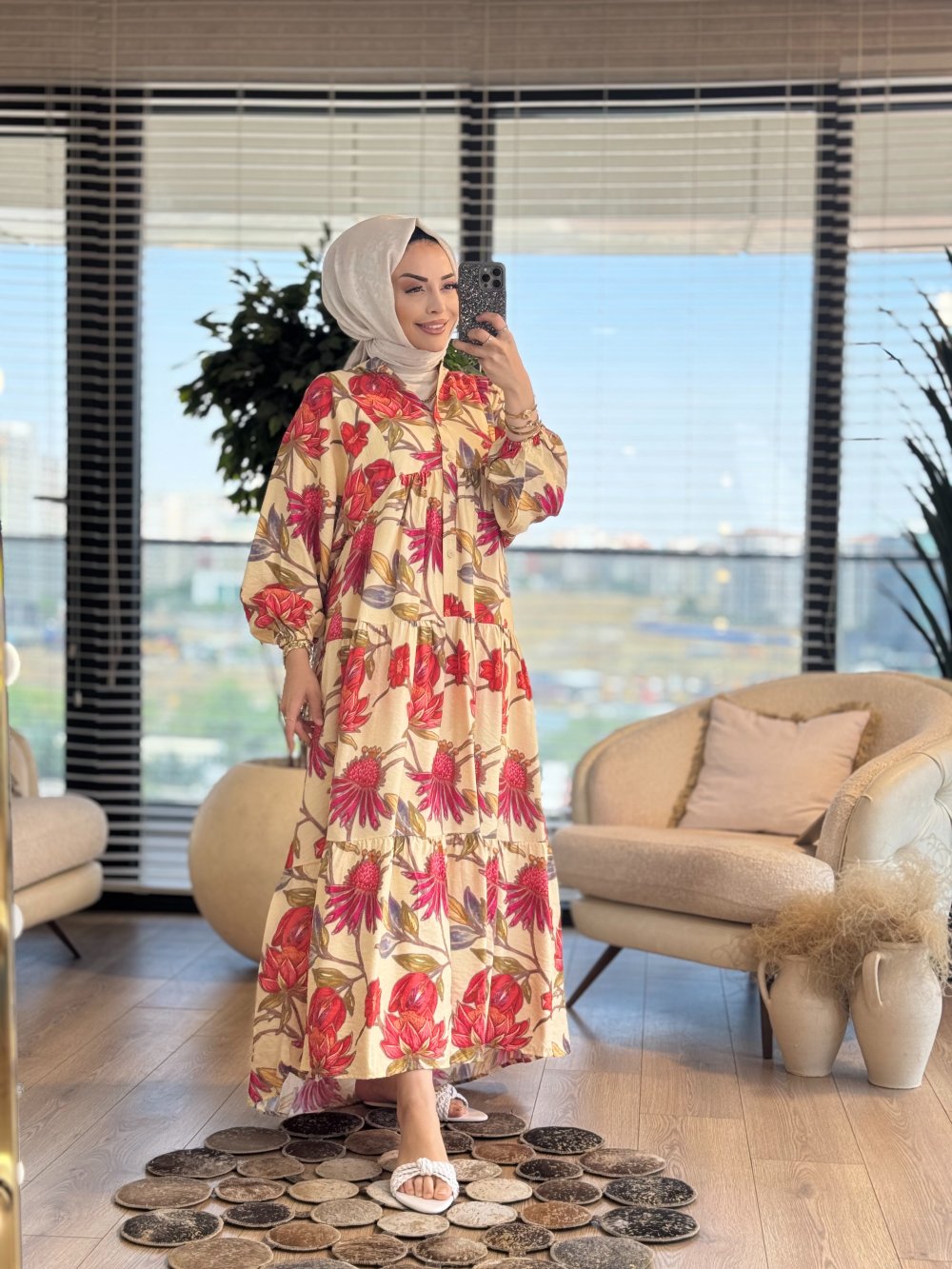 25EL512 Zambak Desenli Elbise Bej Mercan