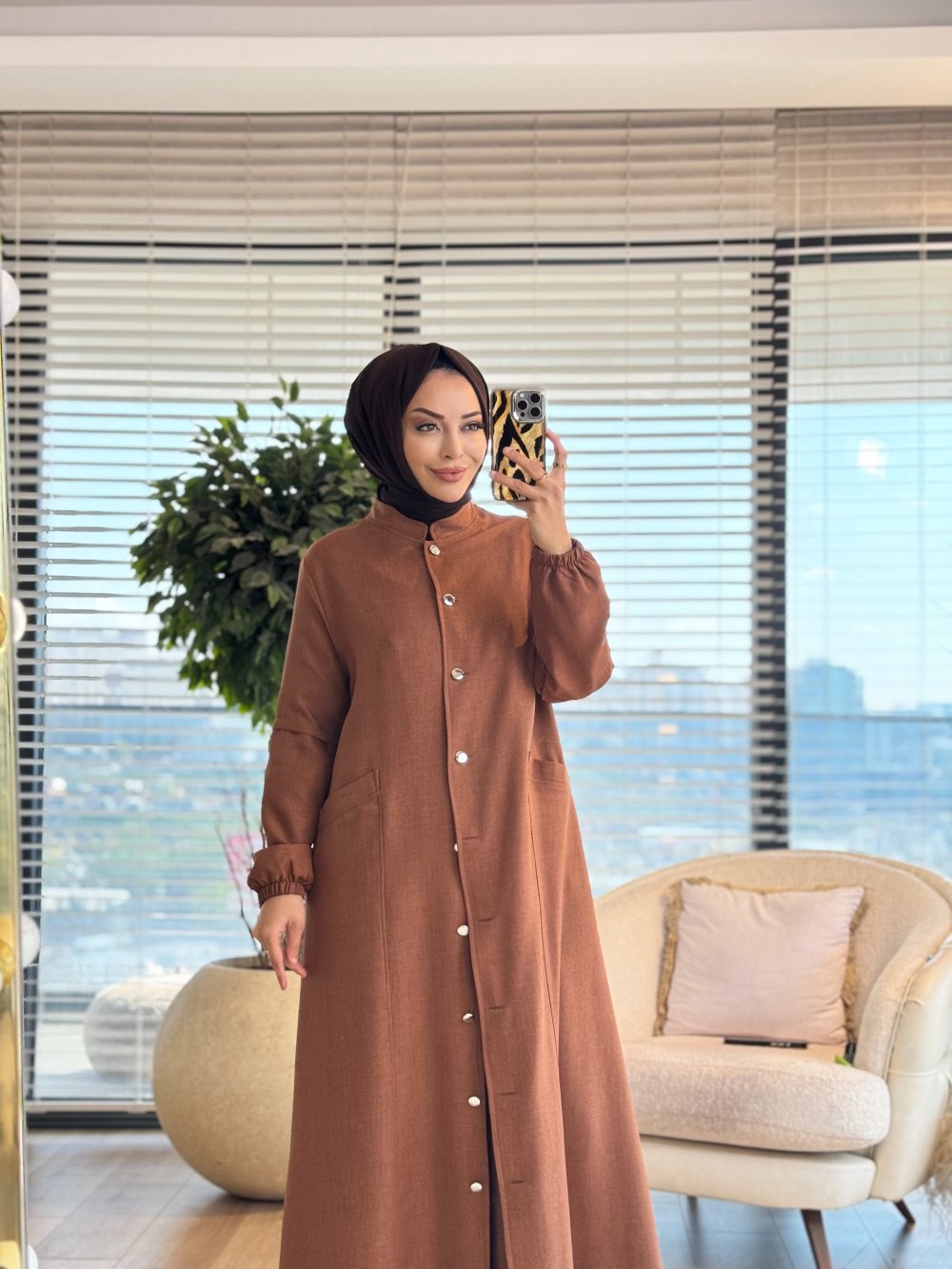26516 Keten Metal Düğmeli Pardesü Kahve