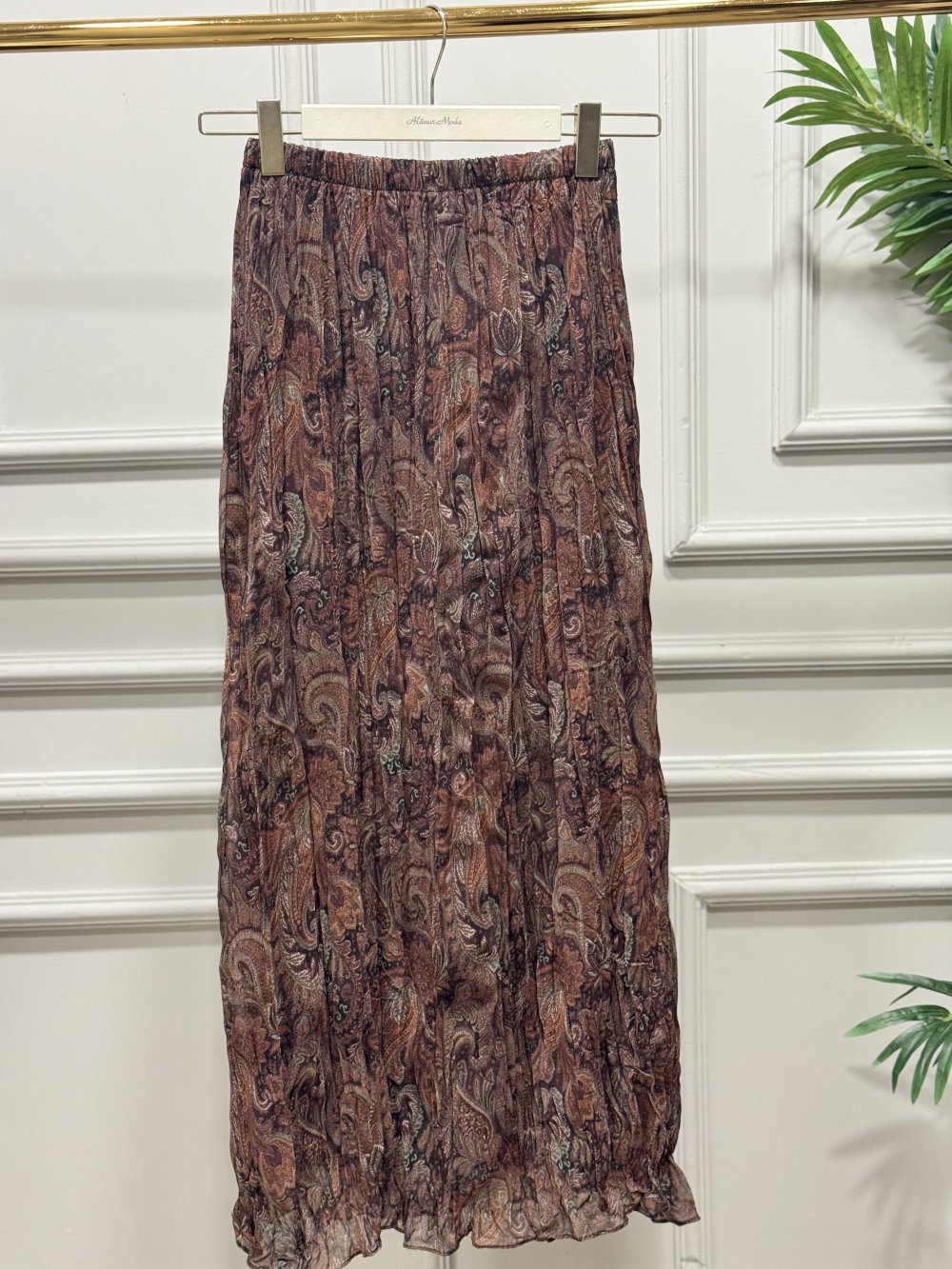 27032 Şifon Şal Desenli Kırışık Etek Kahve