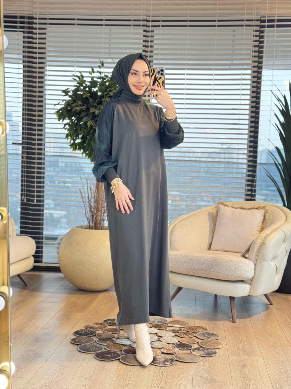277 Kolları Kumaş Desenli Triko Elbise Haki