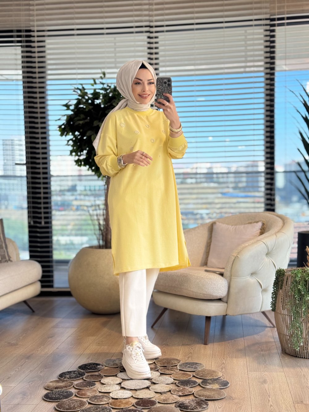 3138 Taş Ve İnci Detaylı Midi Boy SweatShirt Sarı