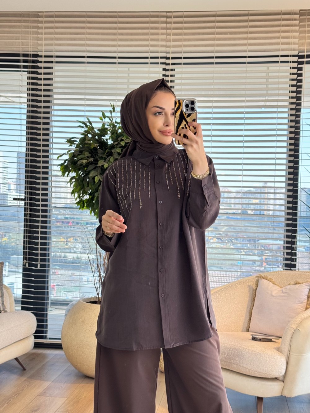 3272 Roba Sıralı Boncuk İşlemeli Gömlek Kahve