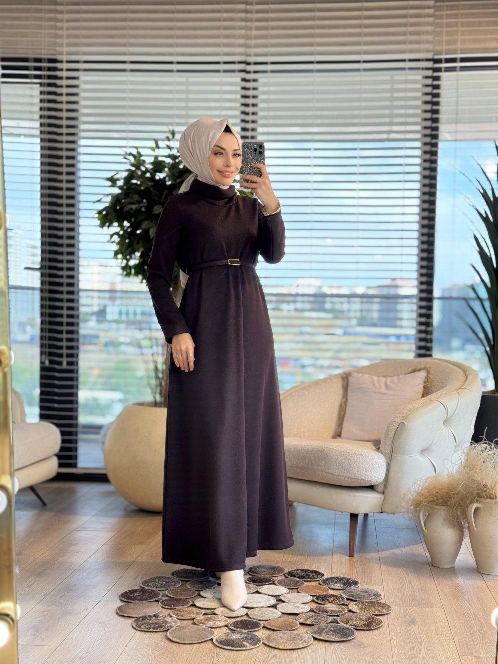 35539 Kemerli Balıkçı Yaka Simli Elbise Kahve