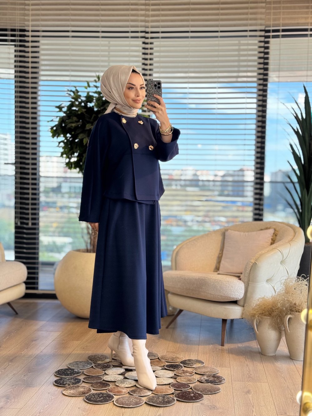 35946 Yarasa Kollu Gold Düğmeli Etekli Takım Lacivert