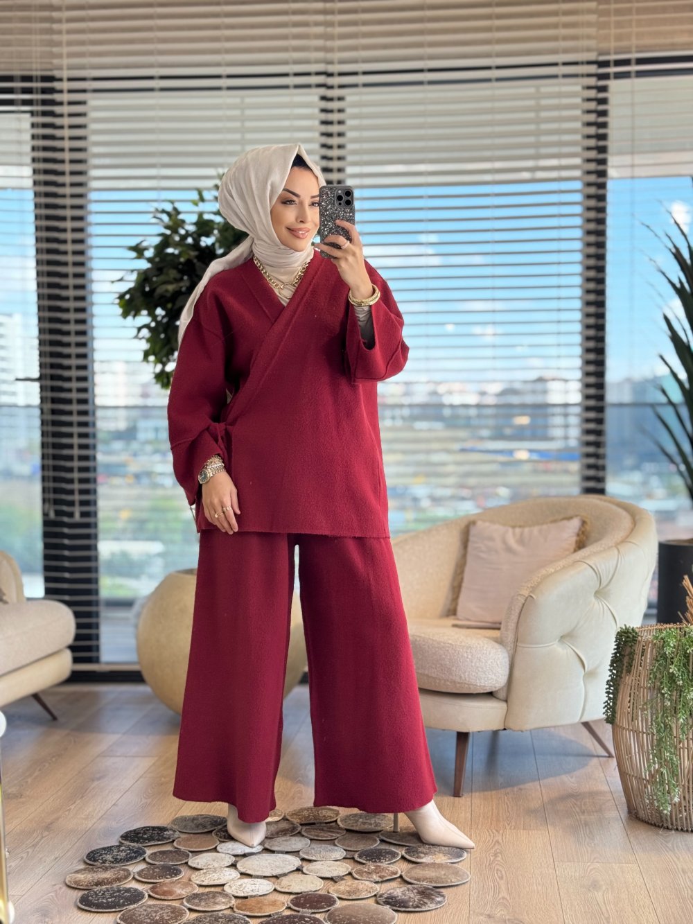 44115 Triko Yandan Bağlamalı Bol Paçalı Pantolon Takım Bordo