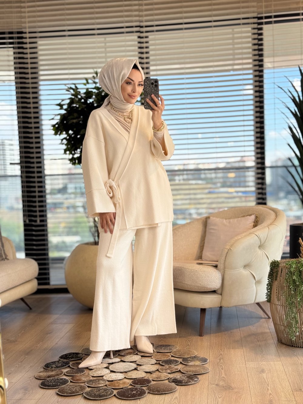 44115 Triko Yandan Bağlamalı Bol Paçalı Pantolon Takım Ekru