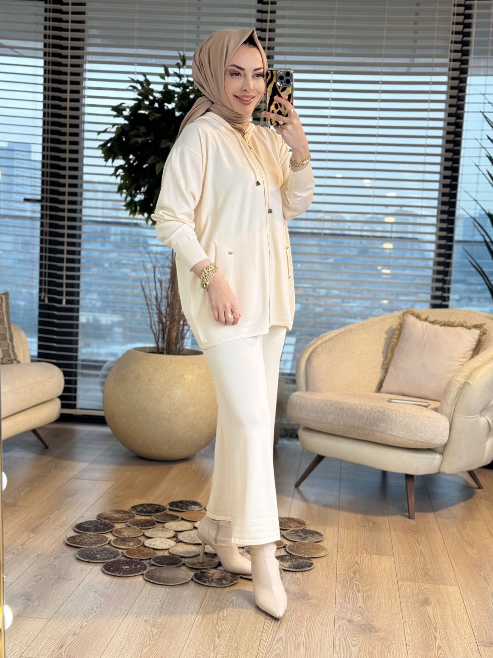44226 Önü Cep Detaylı Kapşonlu Triko Takım Ekru