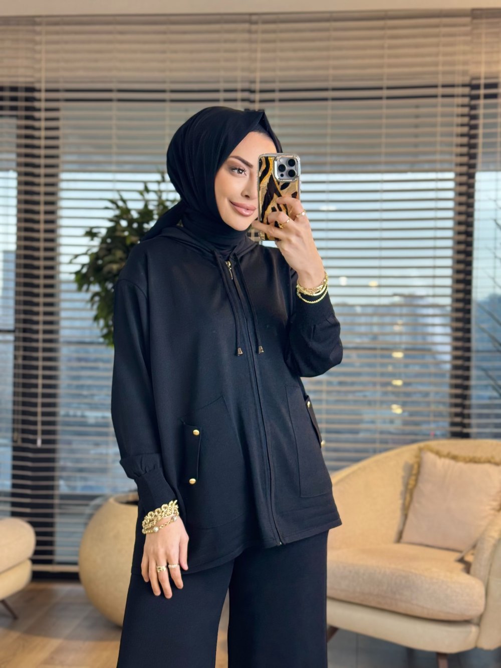 44226 Önü Cep Detaylı Kapşonlu Triko Takım Siyah