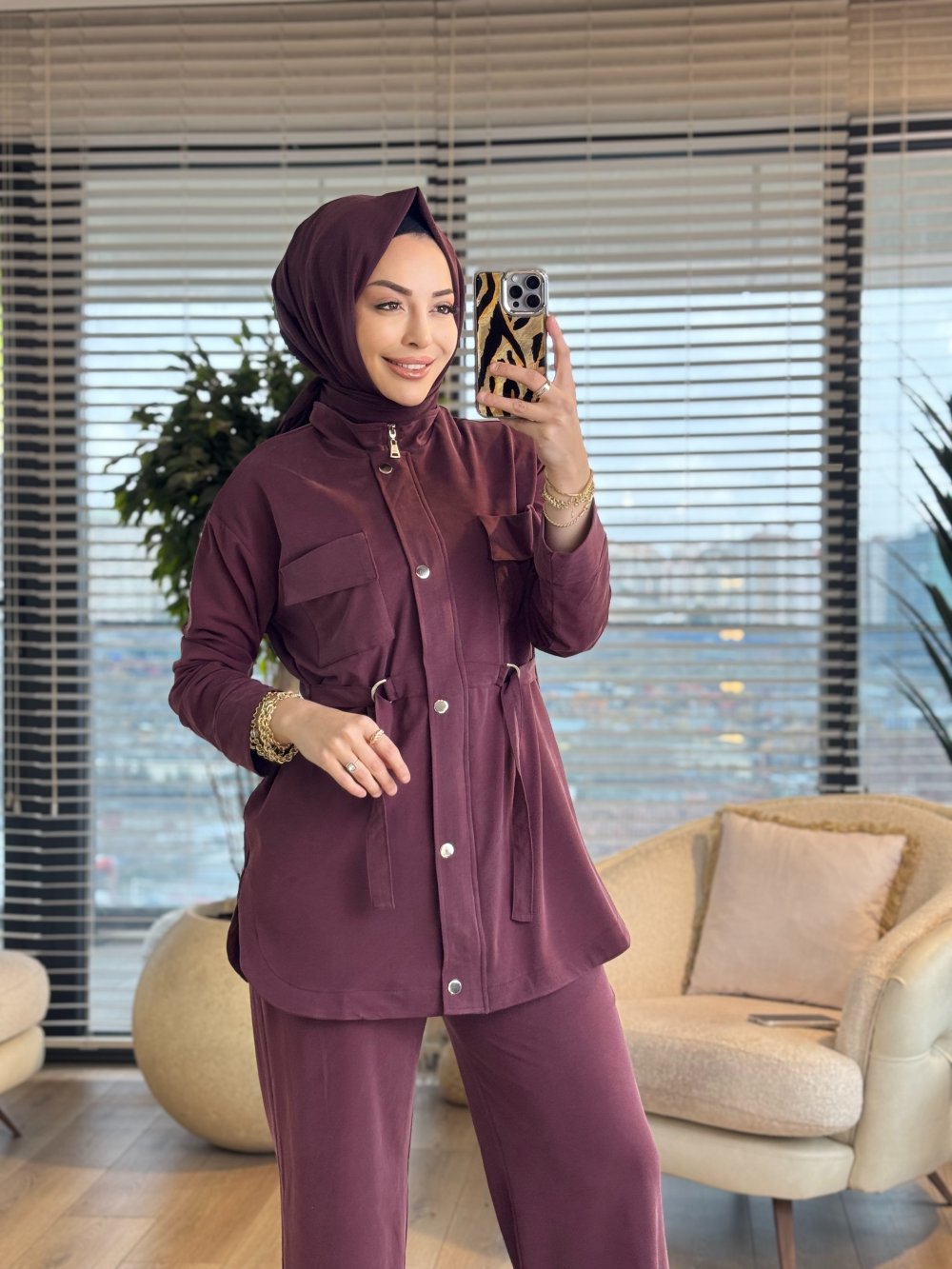 4455 Oysho İki Cepli Kendinden Kuşaklı Takım Bordo