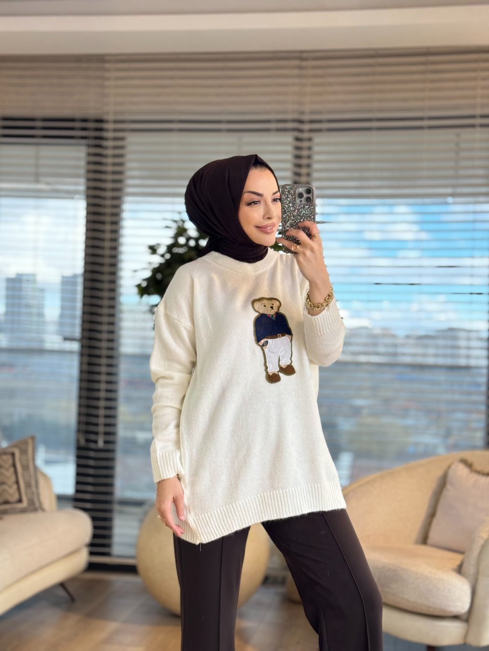 6505 Önü Ayıcık Nakışlı Triko Tunik Ekru