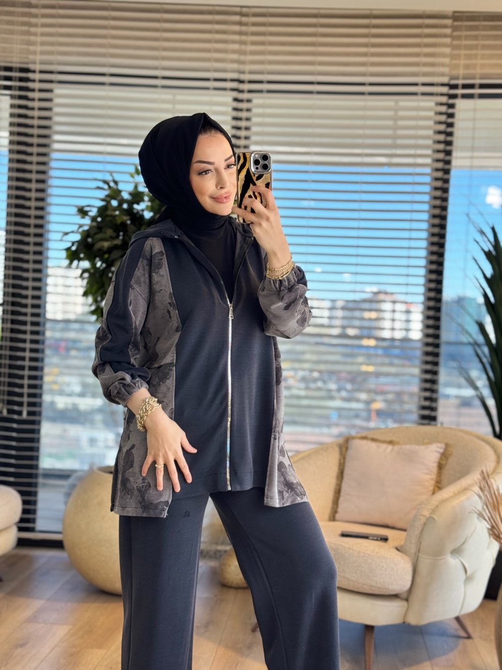 70081-2 Yanları Desenli Kapşonlu Takım Siyah