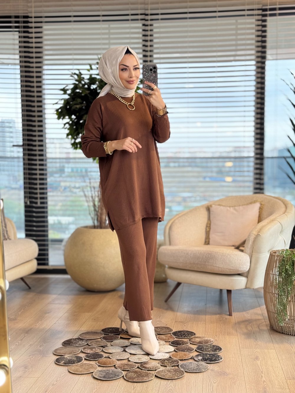 7016 Vanezia Fitilli Triko Pantolonlu Takım Kahve