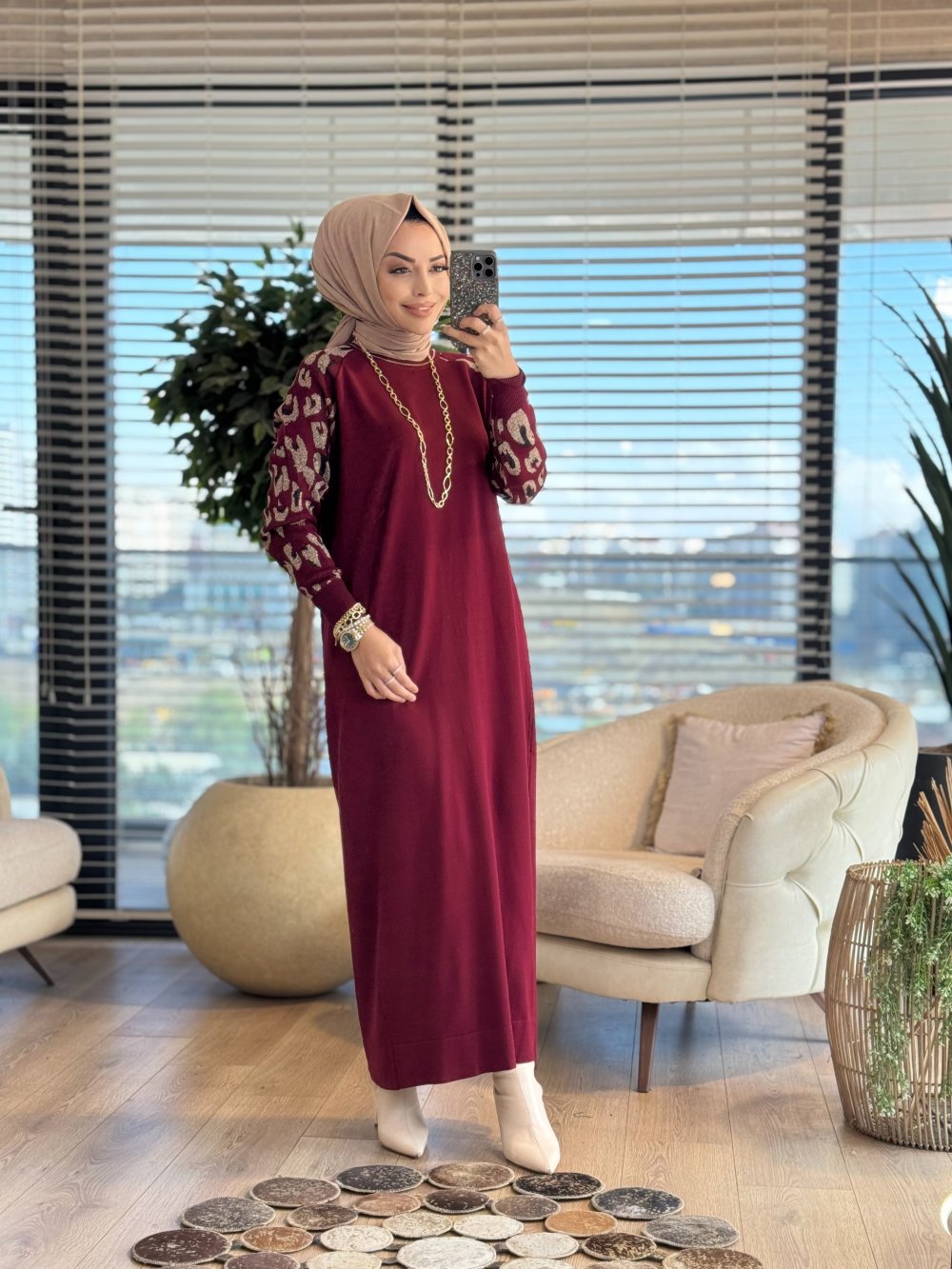 7050 Kolları Leoparlı Vanezia Elbise Bordo