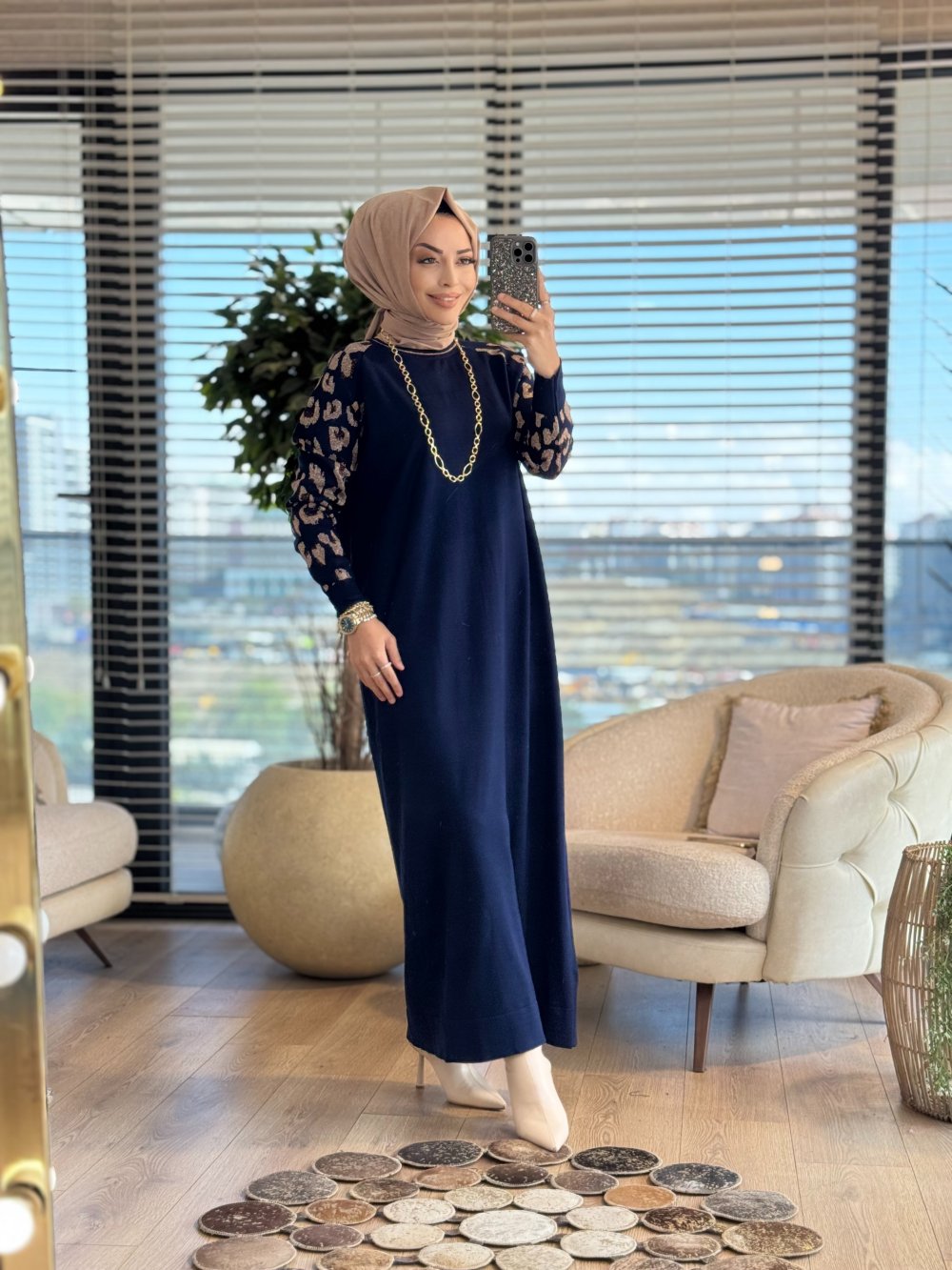 7050 Kolları Leoparlı Vanezia Elbise Lacivert