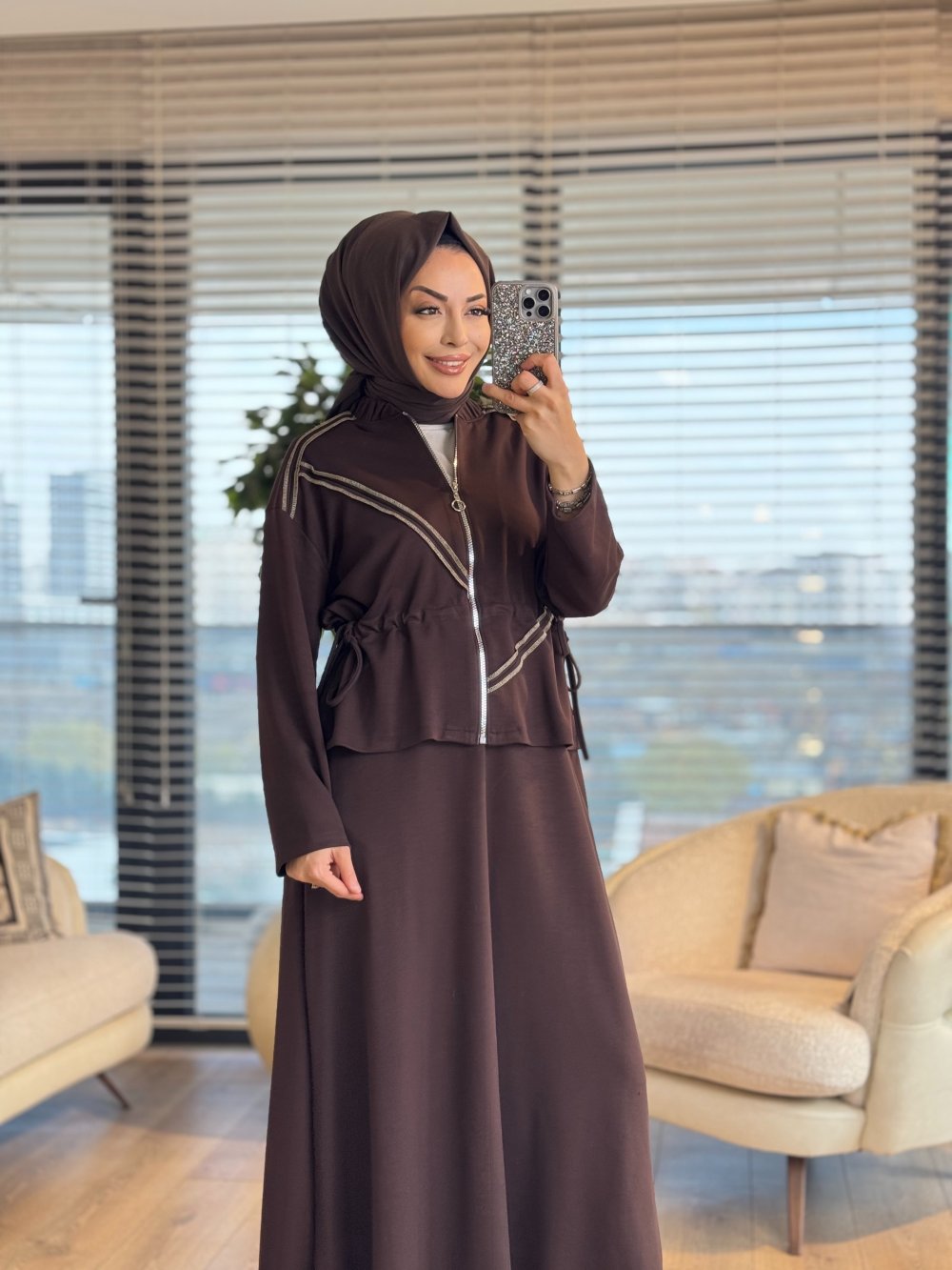 72020 Dikiş Detaylı Fermuarlı Etekli Takım Kahve
