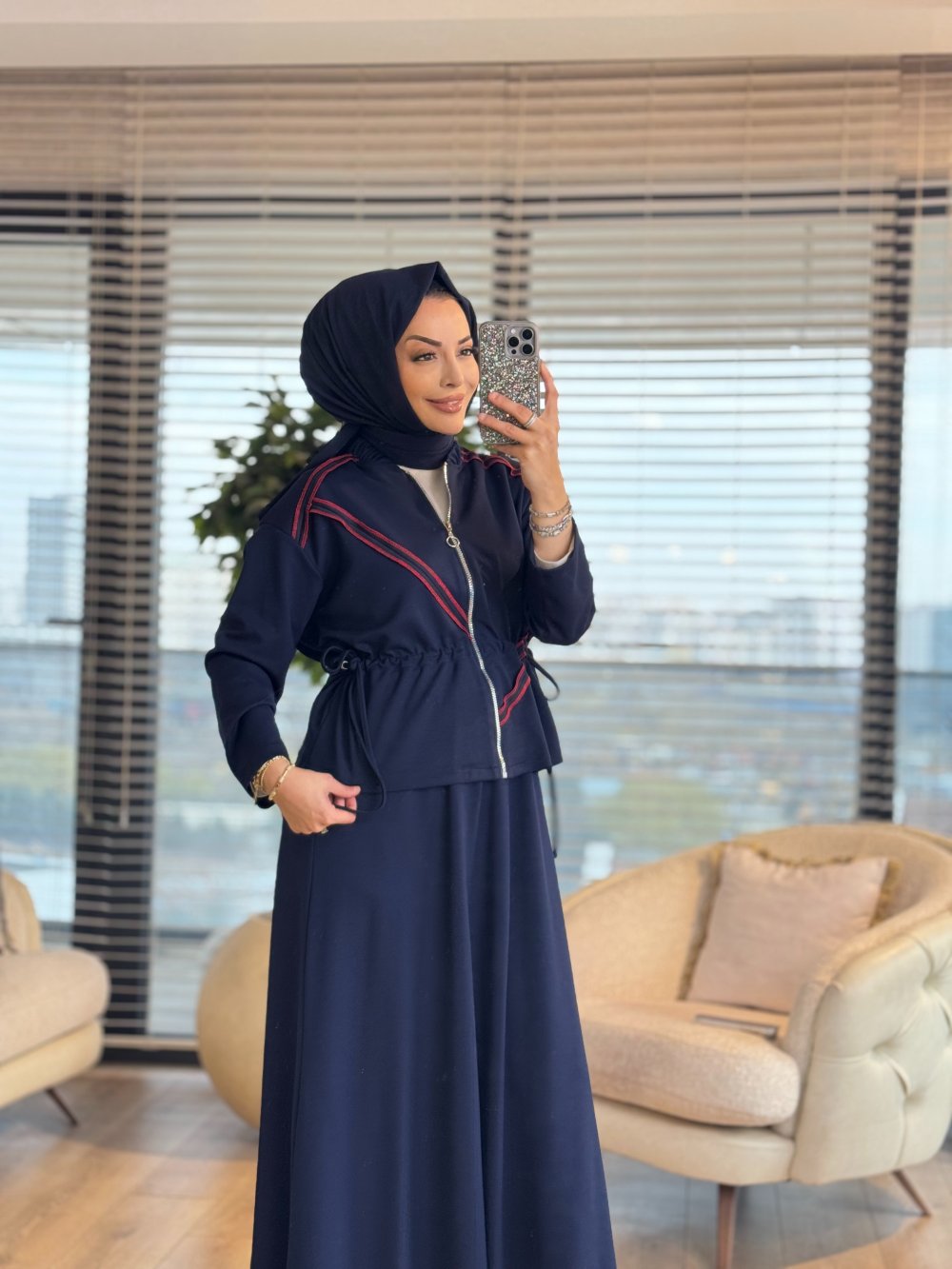 72020 Dikiş Detaylı Fermuarlı Etekli Takım Lacivert