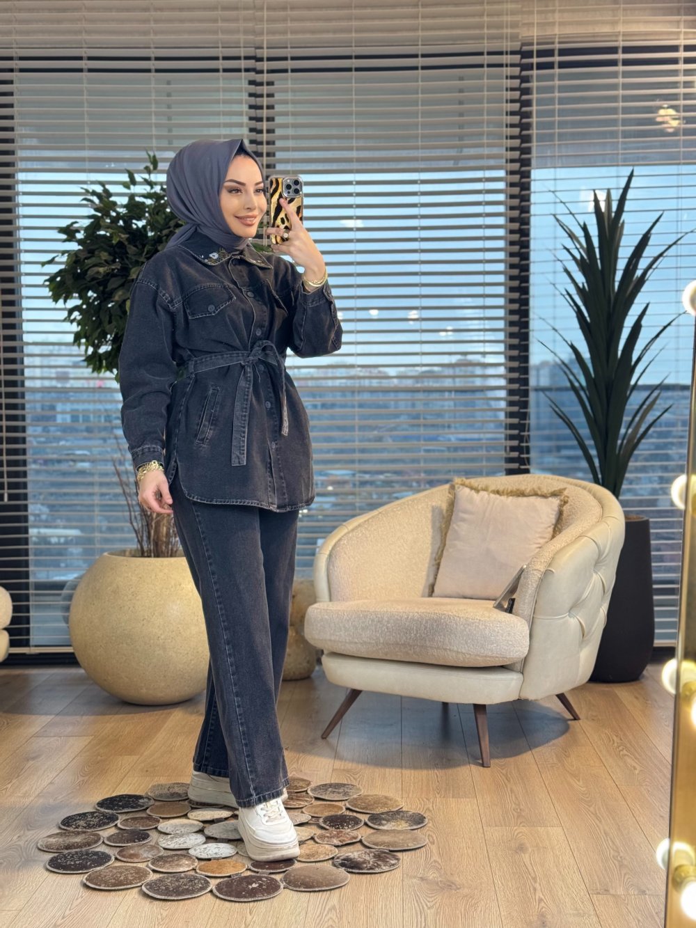 7445 Kot Ön Cepli Yakası Çiçek Nakışlı Takım Antrasit