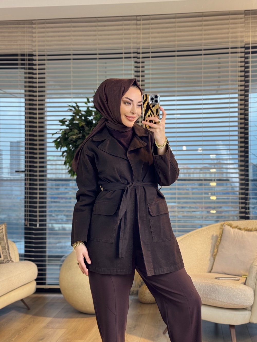 7507 Şal Dügmesiz Kot Trenç Kahve