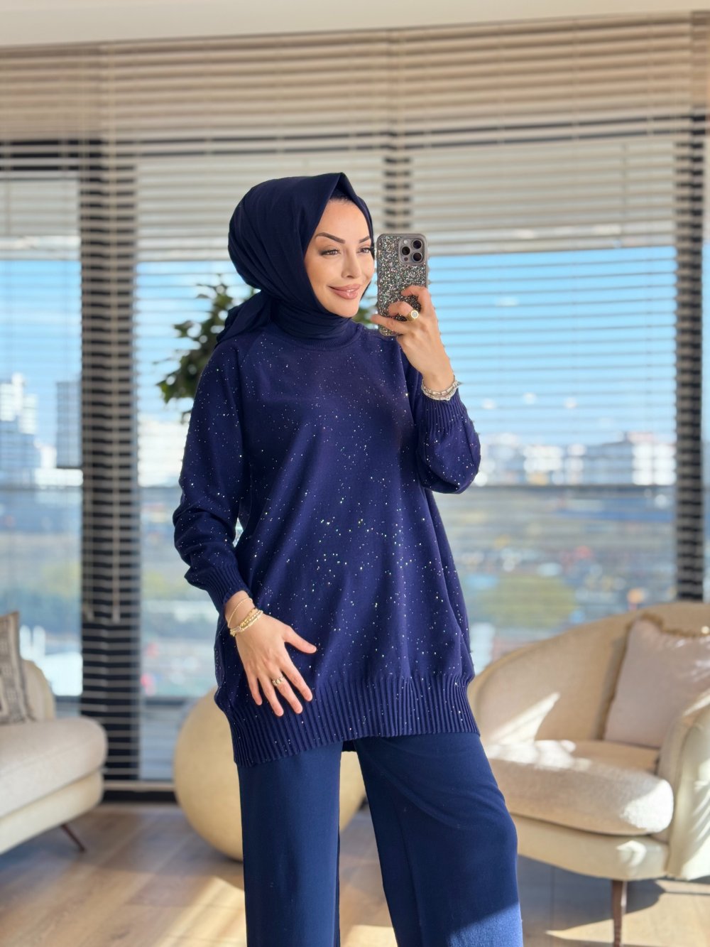 7880 Üstü Serpme Taşlı Triko Tunik Lacivert