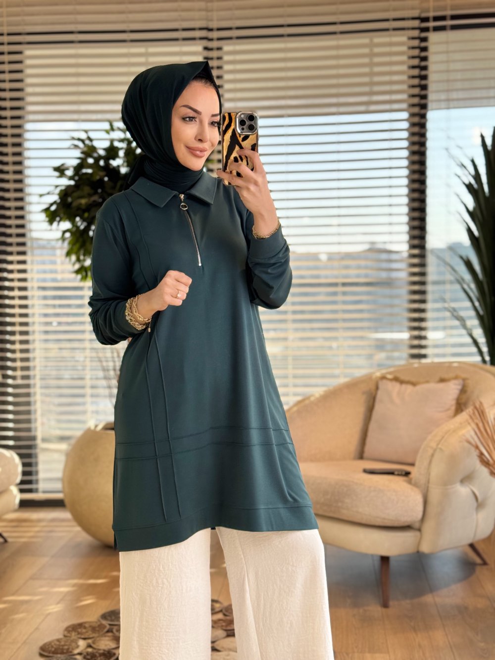 9910 Önü Kordon Biye Detaylı Tunik Zümrüt