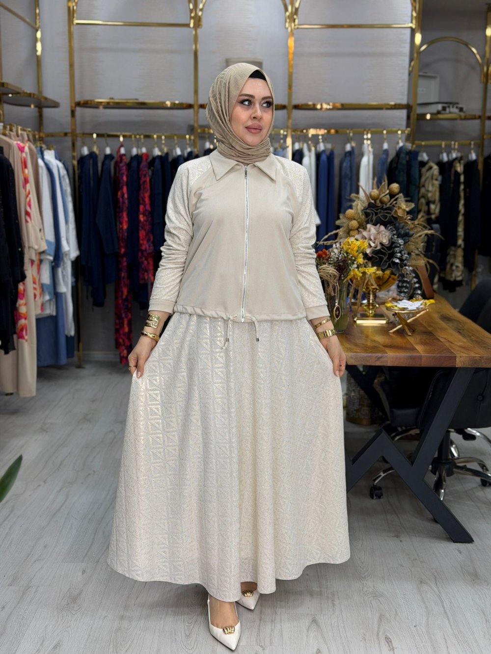Kumaşı örmedir. Etek beli lastikli değildir. Tunik fermuarlıdır. Cep yoktur.