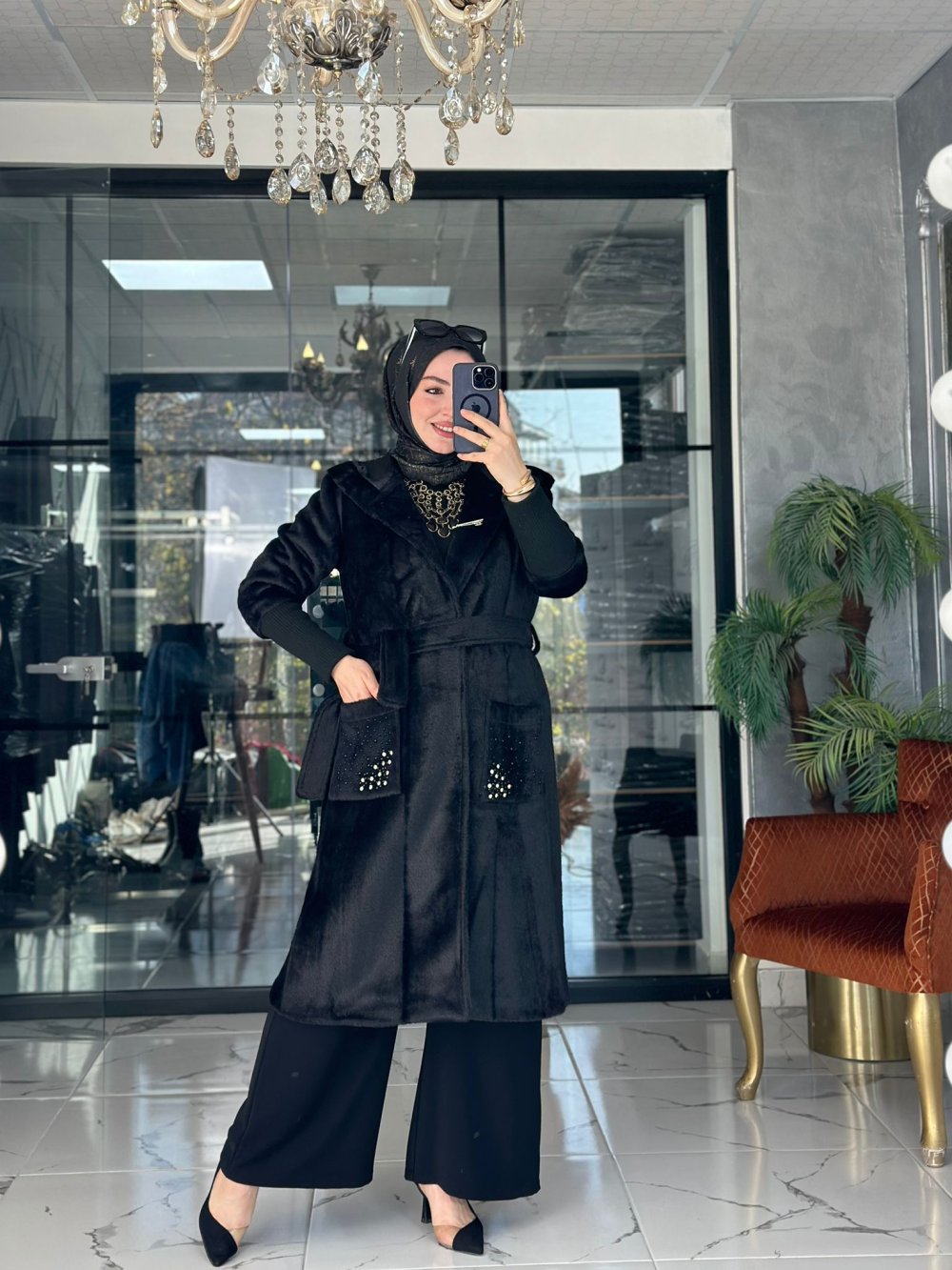 Angora Taşlı Kaban Siyah
