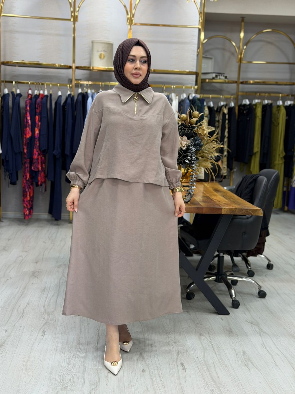 Kumaşı tenseldir. Tunik önü yarım fermuarlıdır. Etek beli lastiklidir.