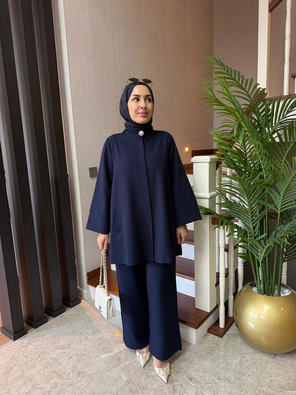 Tunik önden gizli düğmelidir, boynunda gold düğme detayı ve yanlarda cepleri bulunmaktadır.