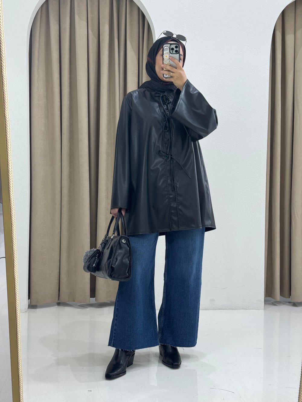 Bağlama Detaylı Uzun Deri Ceket Siyah